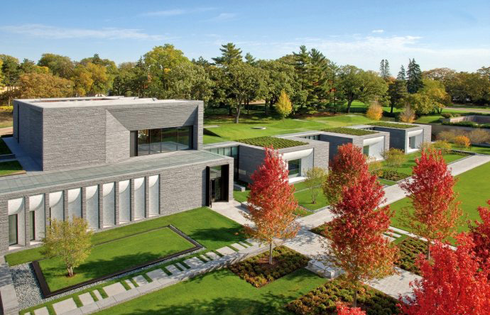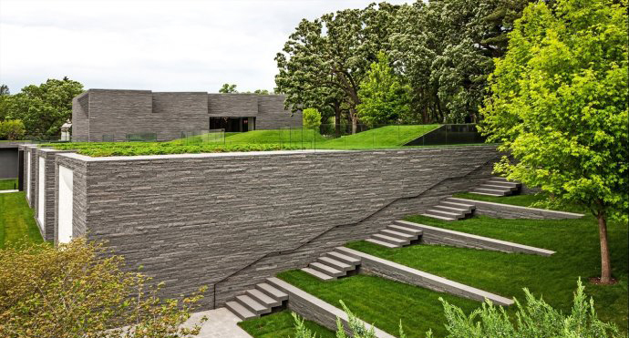 这个设计拥有当代美学的项目和谐地融合进一个重要的历史景观。它通过充分利用这个地方柔和的倾斜比例做到了这一点。较低地平面强大的几何结构逐渐向斜坡上过渡到地上“草坪规划”风景的田园风格。