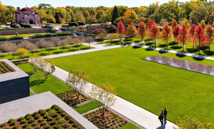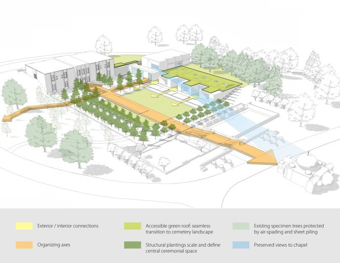 设计师们曾这样描述:“园林静静的环抱着墓地,为游人提供了一处沉思的内在体验的场所。”为了维护墓地的田园品质,墓地坐落于山坡上,墓地的设计保护了历史景观,也保证了光线的充足。