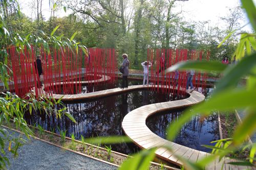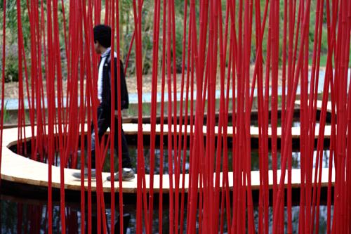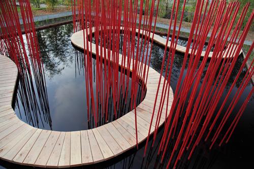 曲线形的木栈道对角穿越方形水池,漂浮于水面。小栈道仅50厘米宽,容一人穿行。它是“圆”的符号,也是体验水池无限风光的路径。水池中间是三丛红色竹竿,它们可取之四周竹林的老杆,是可再生的材料。垂直的竹竿丛沿木栈道分布,令行走在栈道上的游客体验穿越的快感。垂直的竹丛倒影水中,与变换的天景相辉映,创造出宁静和深远的氛围。虽然水深只有30厘米,却通过垂直向天的红色竹竿,创造出无限深远的感觉。方圆周边和水中植物全部为中国植物,渲染出浓郁的中国气氛。