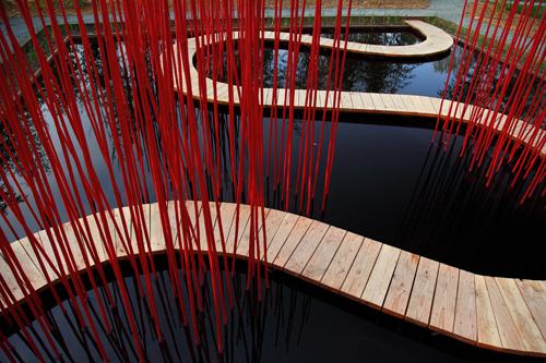 方圆是对中国传统园林的当代解读,整体为外方内圆的形式设计,通过围合空间的建立和运用小中见大的中国园林手法以及填挖方的工程技术,将当代雨水利用理念及传统造园哲学相结合,创造亲切而富有美感的观赏和体验空间。